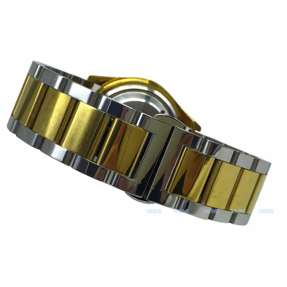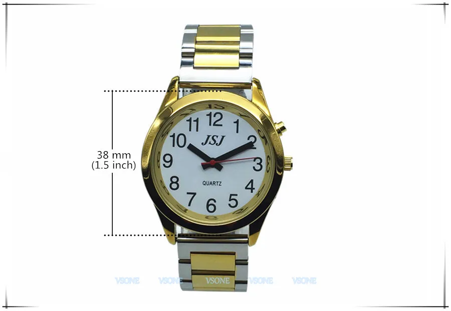 for blind people or visually impaired people like elderly. Talking time or date when simply press one button. Features a golden case with a white face and easy to see black numbers. with alarm function. with a folding clasp band .