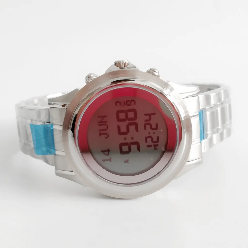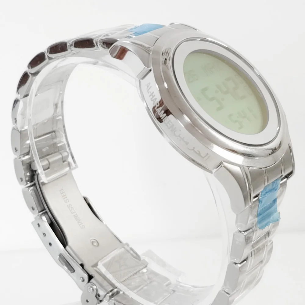 Product name: Azan watch Type: Charm, Digital, Fashion, Luxury Feature: Alarm, Auto Date, Chronograph, Complete Calendar, Day/Date, Water Resistant Material: Stainless Steel Gender: Man and Woman Color: Silver Style: Fashion Function: Prayer Alarm Case material: Stainless Steel Band material: Stainless Steel *Qur'an Bookmark