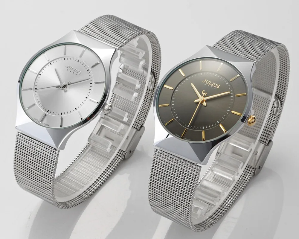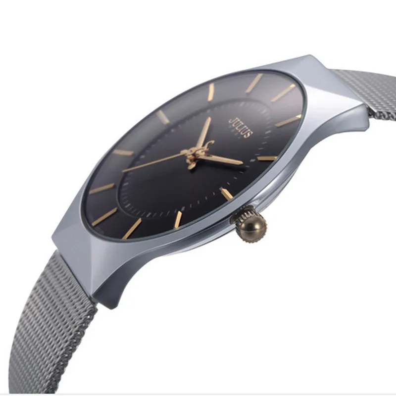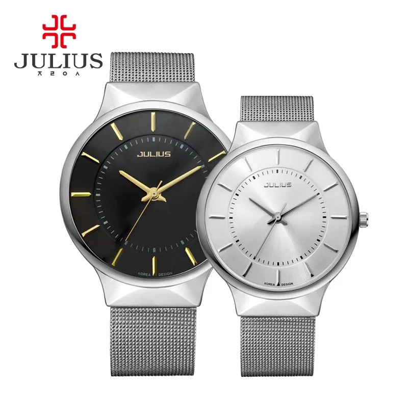 | JULIUS JA-577 Couple Lover Silver Black Ultra Thin Mesh Stainless Steel Quartz Analog Waterproof Fashion Casual Luxury Watch |