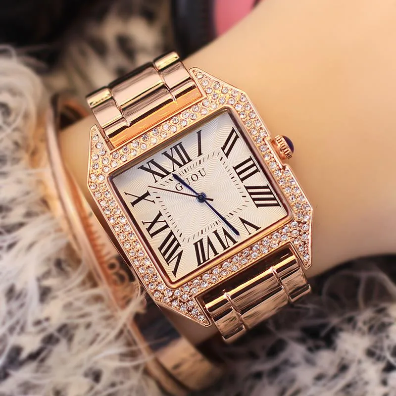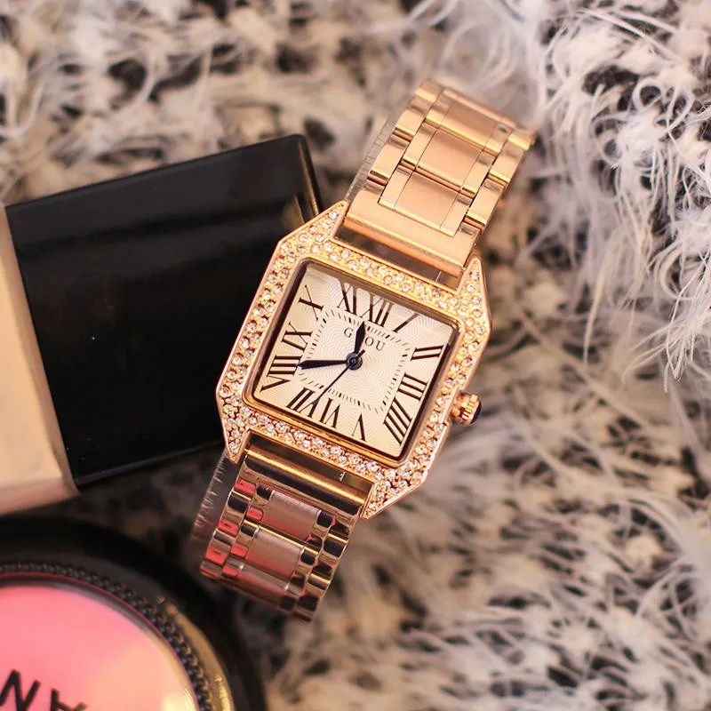 | HK Famous GUOU Brand Fashion Square Luxury Gold Steel Diamond lovers watches Mens Woman Lovers' Higth Grade gift Quartz watches |