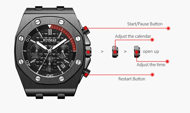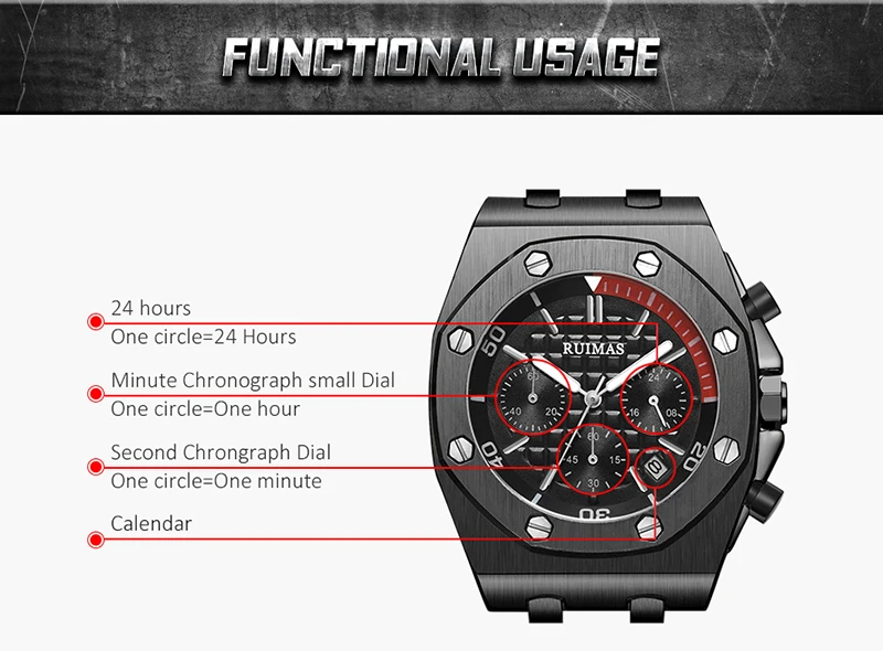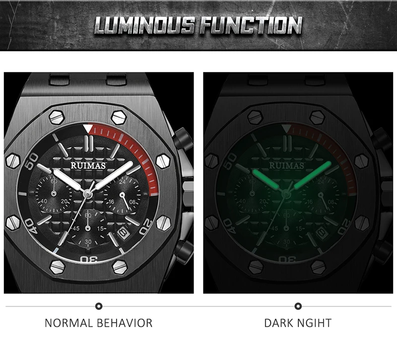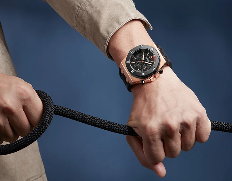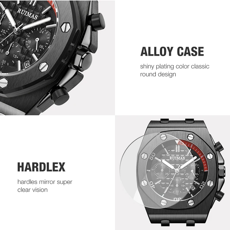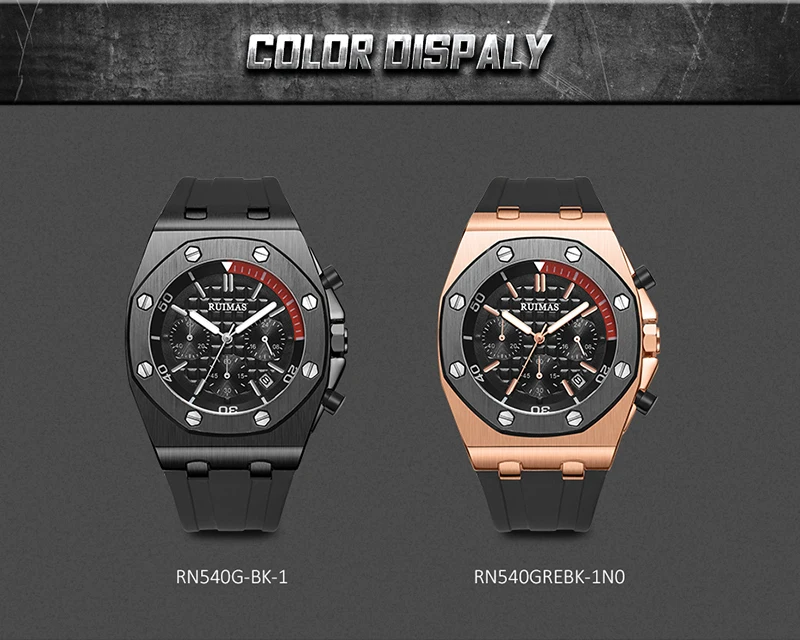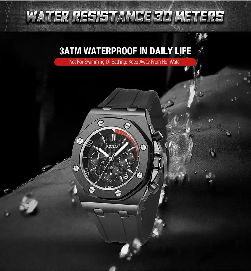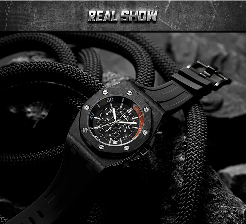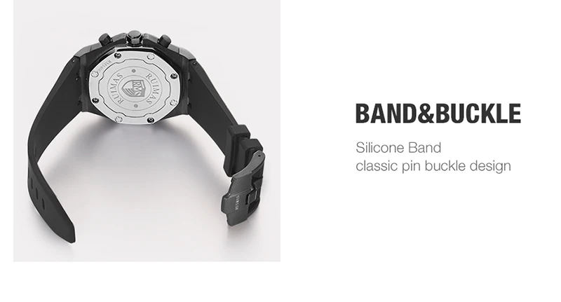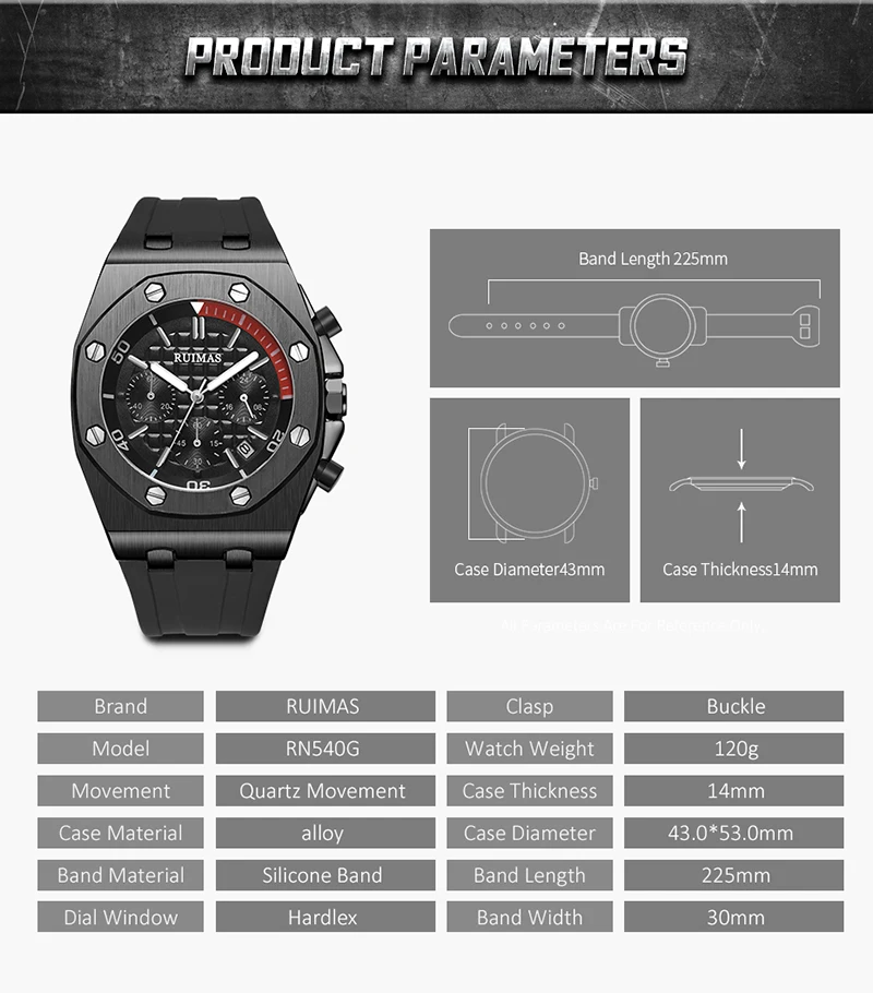 Brand: RuimasClasp: BuckleWatch Weight: 120gMovement: Quartz MovementCase Thickness: 14mmCase Material: AlloyCase Diameter: 43MMBand Material: Silicone BandBand Length: 225mmBand Width: 30MM